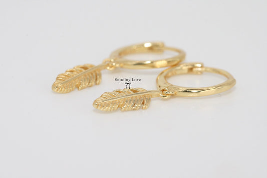 Feather Dangle Huggie Hoop Earrings: 925 Sterling Silver, Boho Style